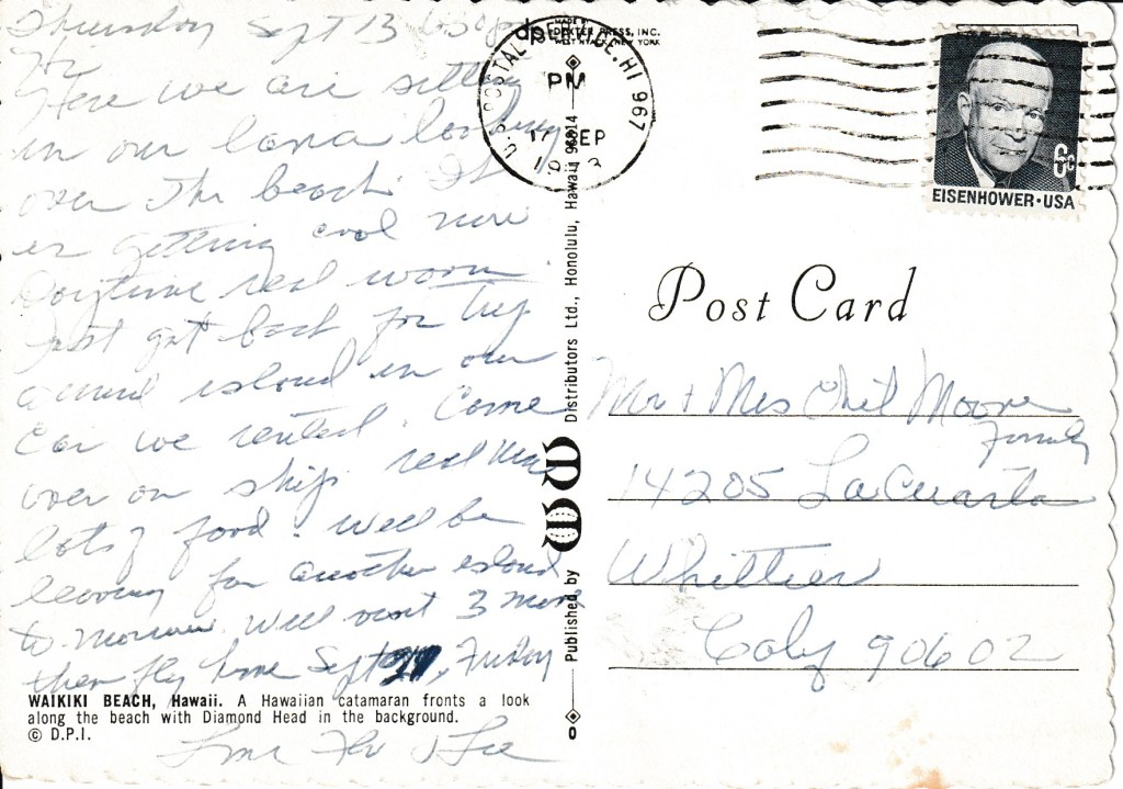 Postmarked in Hawaii on September 17th, 1973, from Flo & Lee to Mr. & Mrs. Chet Moore in Whittier, California.
