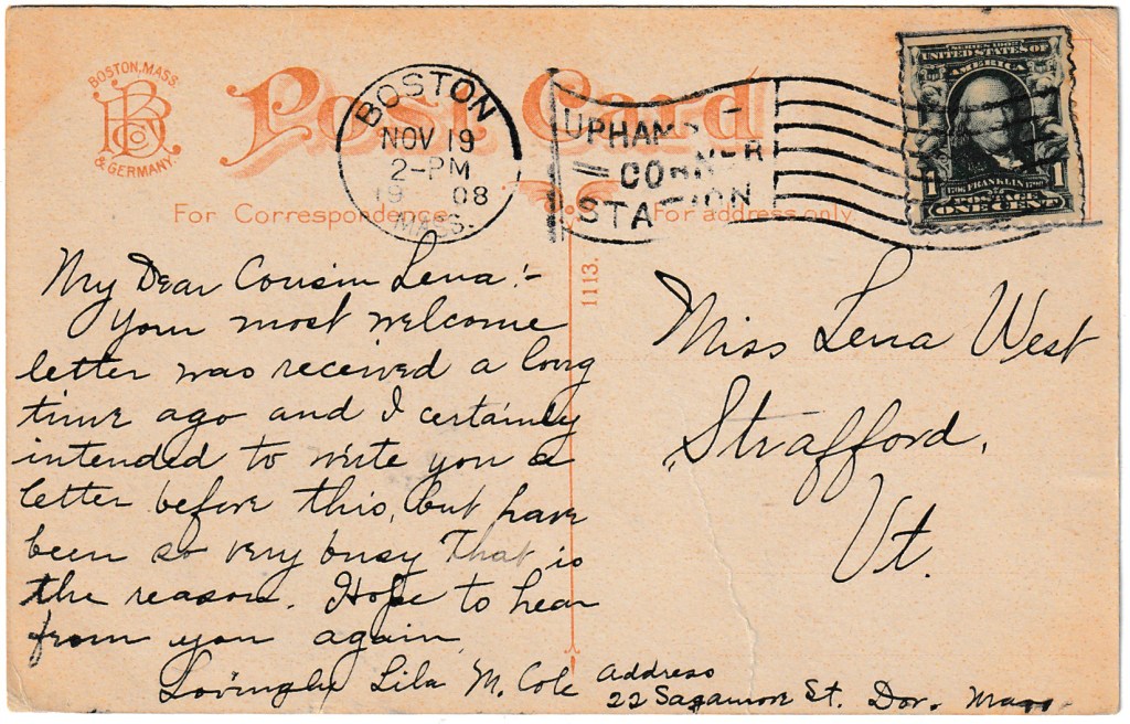 Postmarked in Boston, Massachusetts on November 19th, 1908, from Lila M. Cole to Miss Lena West in Stratford, Vermont.