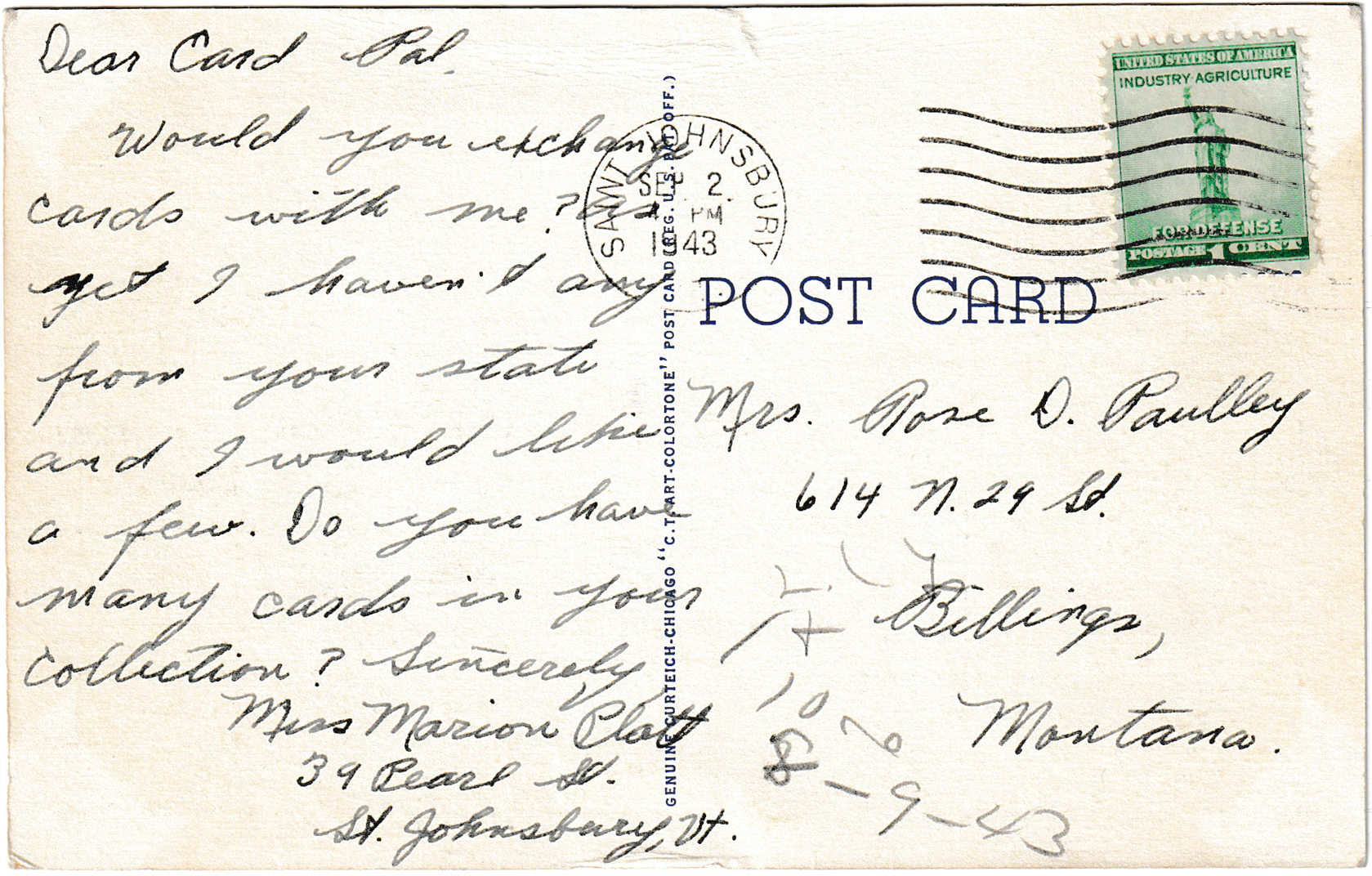 Postmarked in Saint Johnsbury, Vermont on September 2nd, 1943