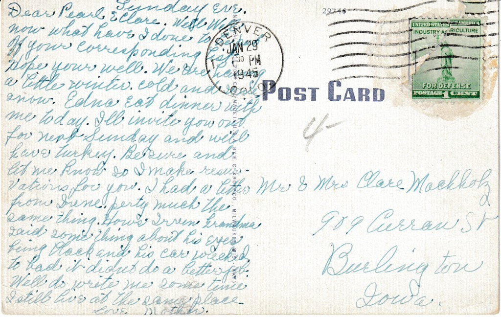 Postmarked in Denver, Colorado on January 29th, 1945.