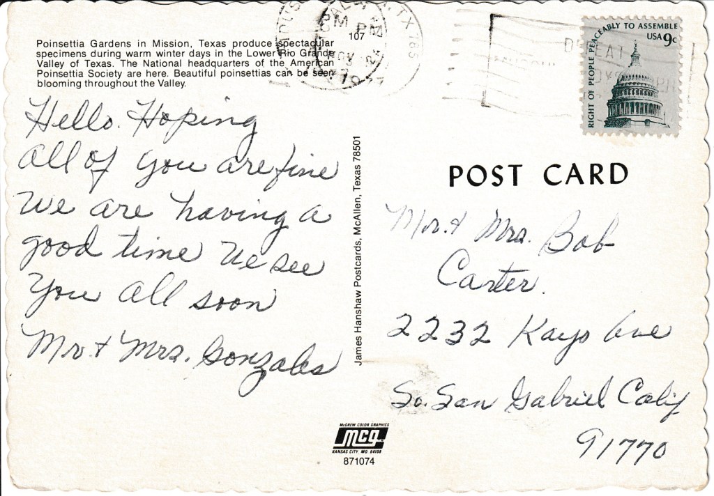 Postmarked in Hudson, Texas on March 11th, 1977, from Mr. & Mrs. Gonzales to Mr. & Mrs. Bob Carter in San Gabriel, California.