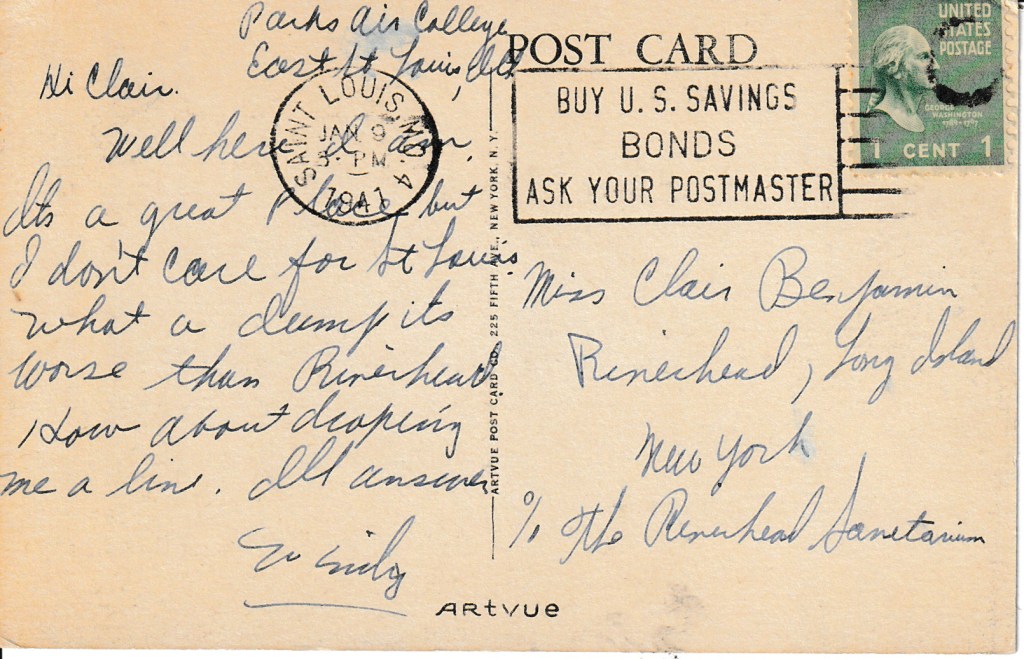 Postmarked in Saint Louis, Missouri on January 9th, 1941, from Windy to Miss Clair Benjamin in Long Island, New York.