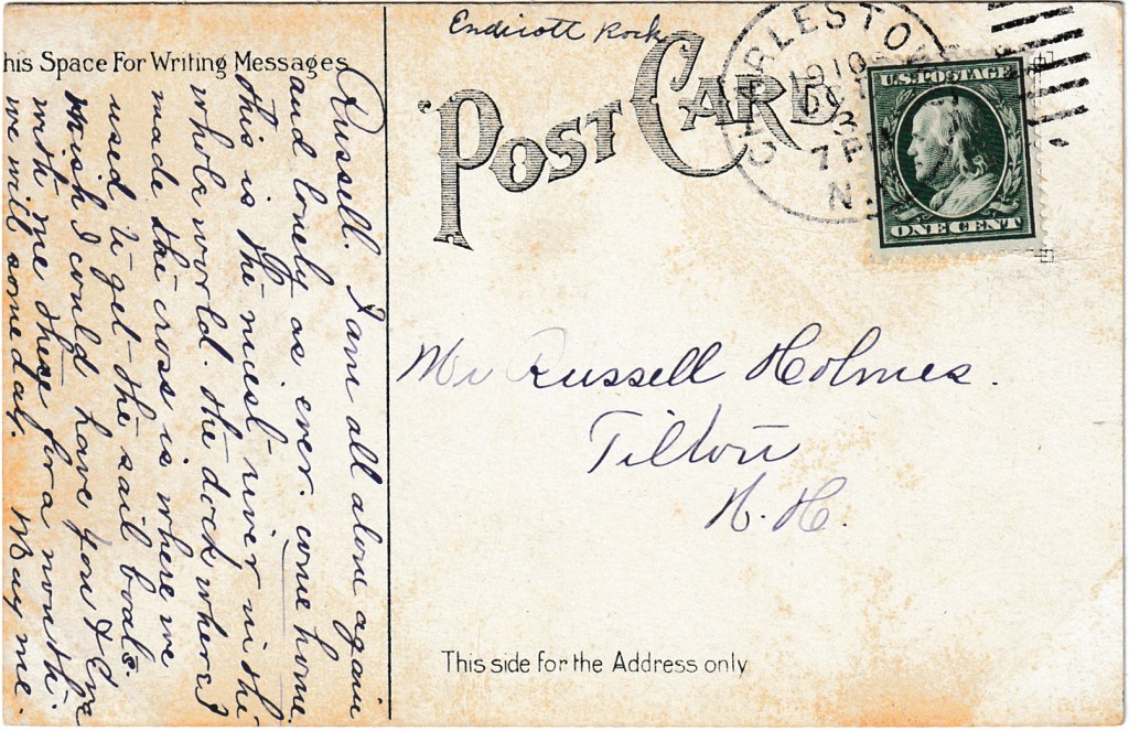 Postmarked in Charlestown, New Hampshire on October 3rd, 1910, from Mayme to Mr. Russell Holmes in Tilton, New Hampshire.
