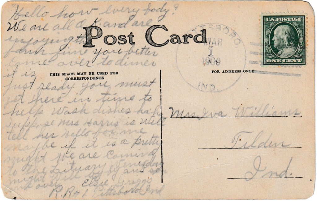 Postmarked in Pittsboro, Indiana on March 1st, 1909, from Elsie Griggo to Miss Iva Williams in Tilden, Indiana.