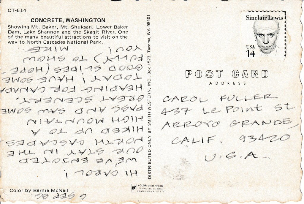 Postmarked in Concrete, Washington on September 6th, 1986, from Mike to Carol Fuller in Arroyo Grande, California.
