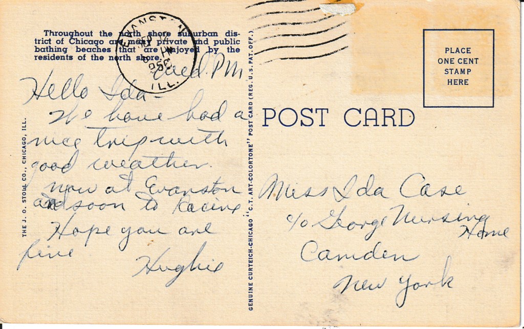 Postmarked in Evanston, Illinois on September 17th, 1950, from Hughie to Miss Ida Case in Camden, New York.