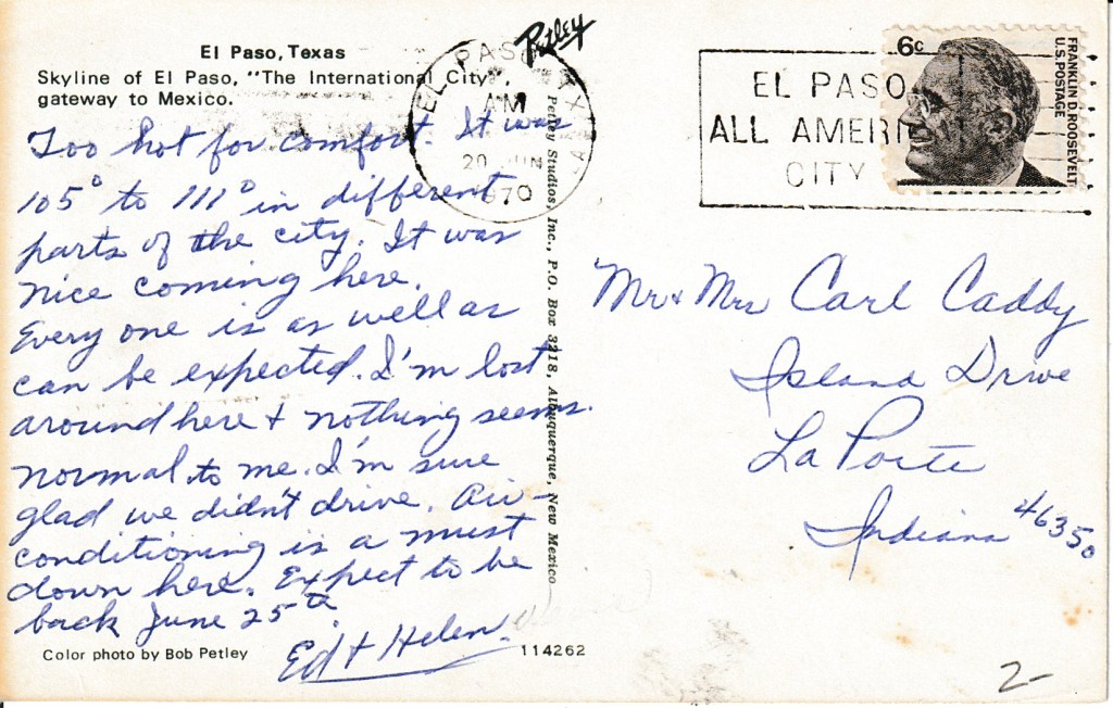 Postmarked in El Paso, Texas on June 20th, 1970, from Ed & Helen to Mr & Mrs Carl Caddy in LaPointe, Indiana.