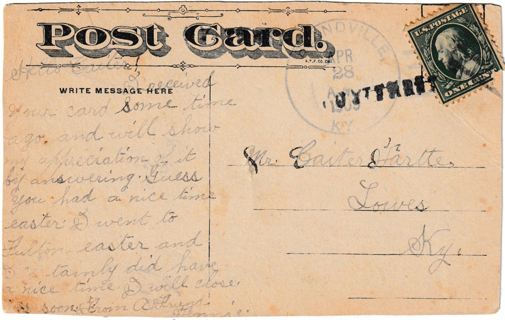 Postmarked in Blandville, Kentucky on August 28th, 1909, from Henrie to Mr. Carter Hartte in Lowes, Kentucky.