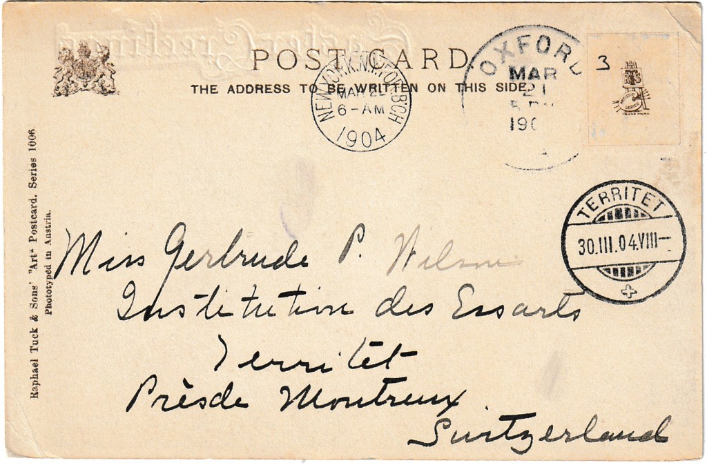 Postmarked in Oxford, England on March 22nd, 1904, to Miss Gertrude P. Wilson in Montreux, Switzerland.
