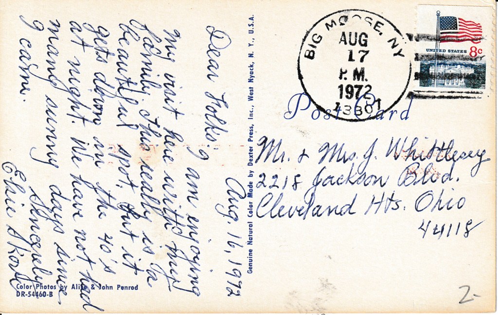 Postmarked in Big Moose, New York on August 17th, 1972, from Elsie Kove to Mr. & Mrs. J. Whittlesey in Cleveland, OH.