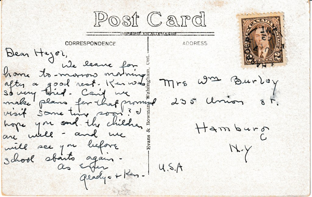 Postmarked in Ontario, Canada on August 7th, 1943, from Gladys & Ken to Mrs. Wm. Burley in Hamburg, New York.
