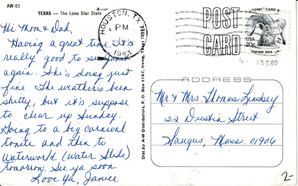 Postmarked in Houston, Texas on June 21st, 1983, from Janice to Mr. & Mrs. Thomas Linsbey in Saugus, Massachusetts.