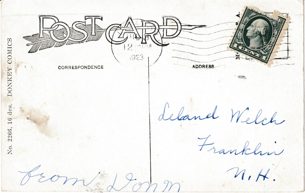 Postmarked in Lebanon, New Hampshire on July 3rd, 1923, from Donn to Leland Welch in Franklin, New Hampshire.