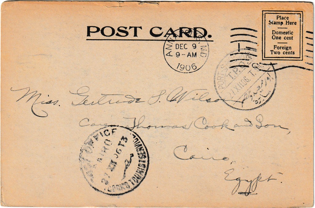 Postmarked in Annapolis, Maryland on December 9th, 1906, to Miss Gertrude P. Wilson in Cairo, Egypt.
