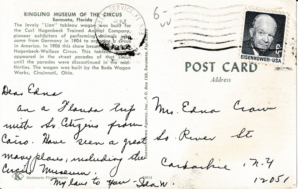 On a Florida trip with Sr. Calíjeris from Cairo. Have seen a great many places, including the Circus Museum.