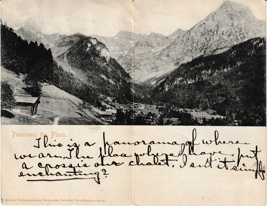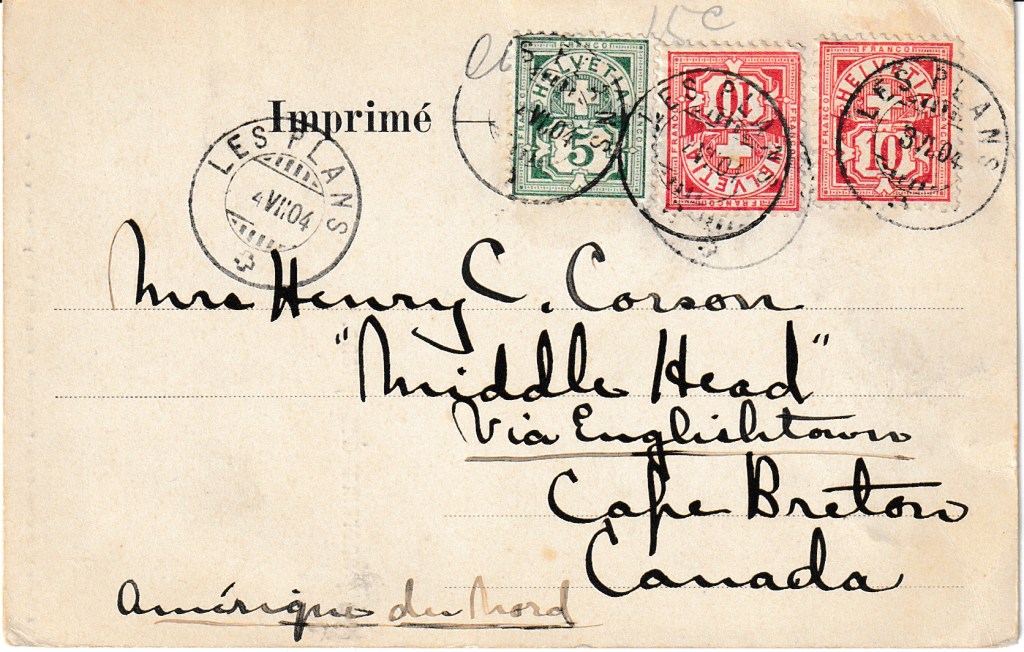 Postmarked on July 4th, 1904 in Les Plans, Switzerland, to Mrs. Henry C. Carson in Cafe Brenton, Canada.