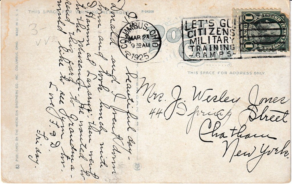 Postmarked in Columbus, Ohio on March 21, 1925, from F.O.D. to Mrs. J Wesley James in Chatham, New York.