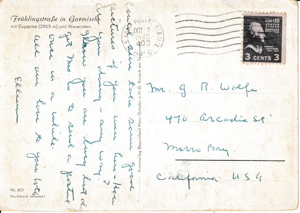 Postmarked by the US Army Postal Service on October 9, 1950, from Ellenanne to Mr. G. R. Wolfe in Morro Bay, California.