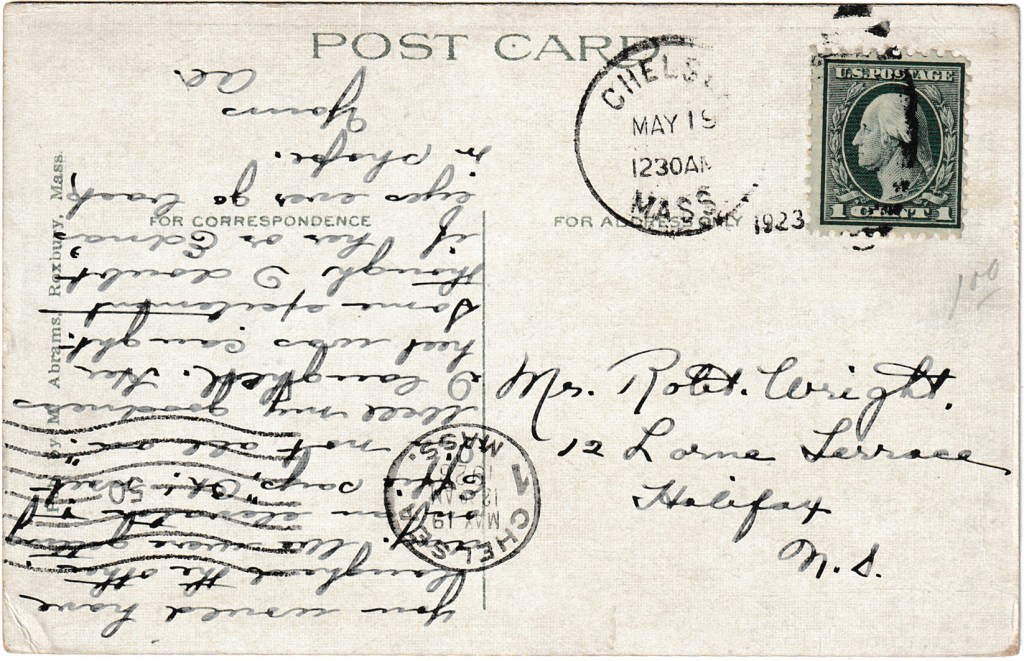 Postmarked in Chelsea Massachusetts on May 19, 1923, from Al to Mr. Robert Wright to in Halifax, Nova Scotia, Canada.