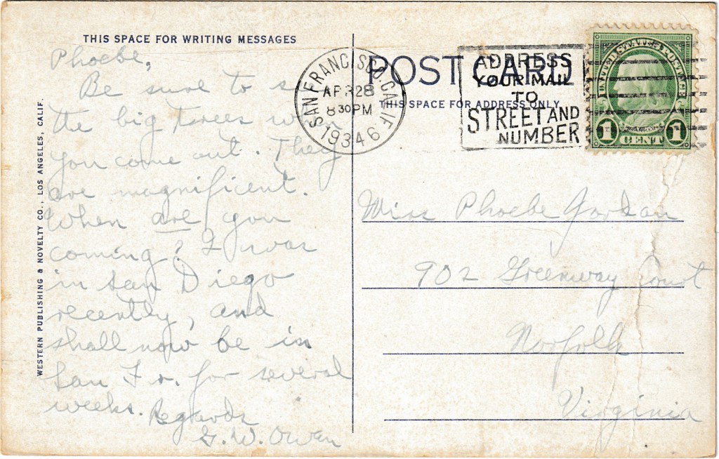 Postmarked in San Francisco, California on April 28, 1934, from G.W. Owen to Miss Phoebe Jordan in Norfolk, Virginia.