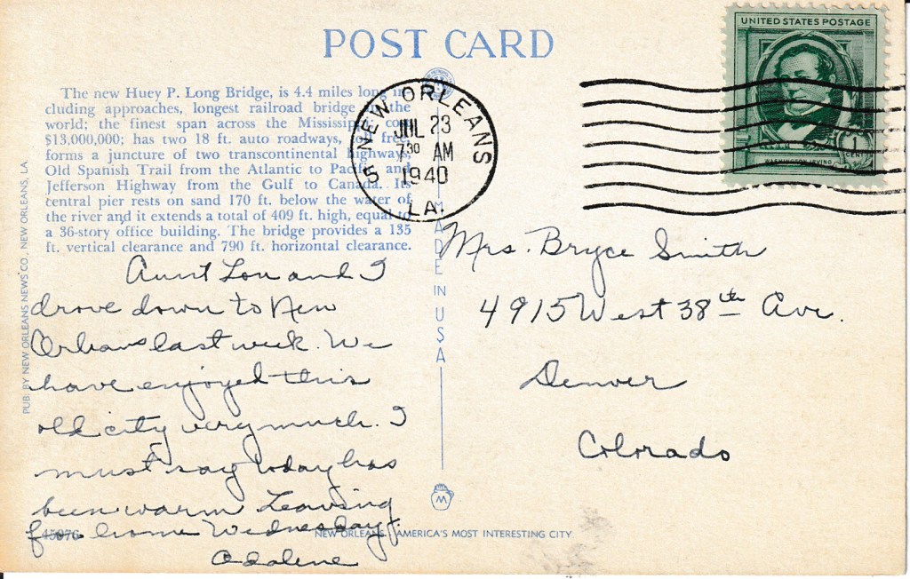 Postmarked in New Orleans, Louisiana on July 23, 1940, from Adaline to Mrs. Bryce Smith in Denver, Colorado.